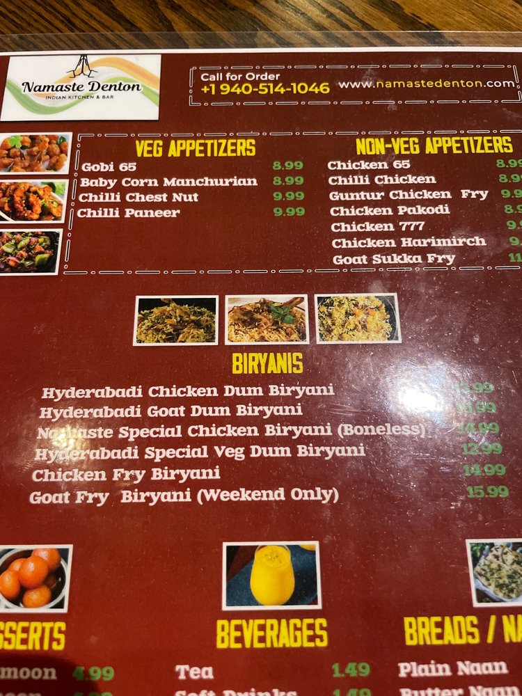 Introducing the menu at Namaste Denton, an Indian restaurant located in Denton, TX, known for its delectable dishes and efficient delivery and takeout services. The menu boasts a variety of soups, both vegetarian and non-vegetarian, with options like Veg Clear Soup, Mutton Soup, and Chicken Mancho Soup. Their appetizers include popular choices like Paneer 65, Gobi Manchurian, and Spring Rolls. Customers have raved about their Chicken Biryani, Garlic Naan, and Gobi Manchurian. The portions are generous, prices are reasonable, and the flavors are authentic and satisfying. From mild to spicy, the dishes cater to a range of preferences. With a cozy ambiance and friendly service, Namaste Denton is a favorite spot for Indian cuisine enthusiasts in the area.